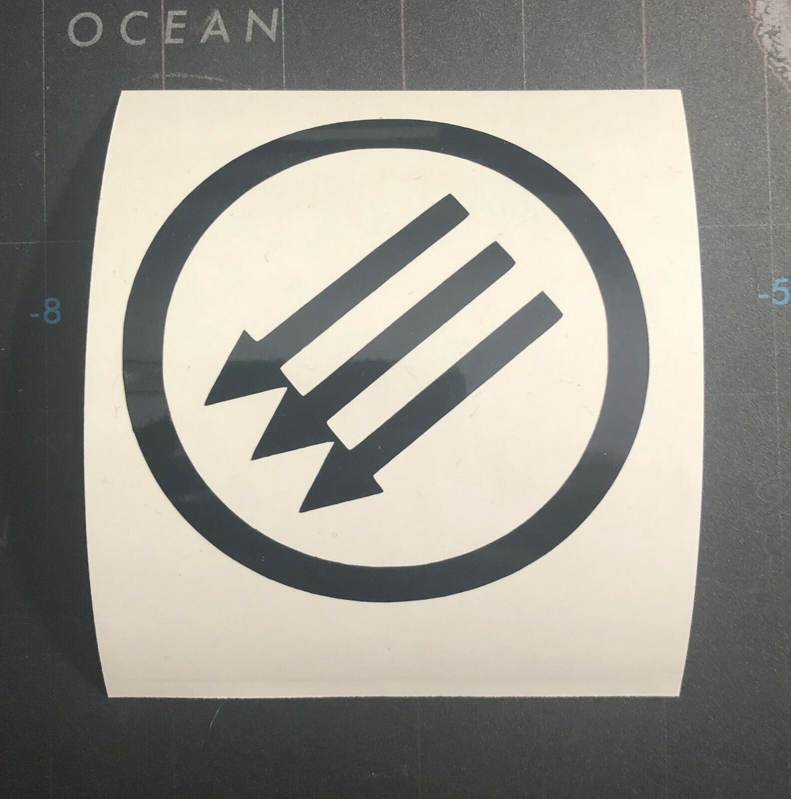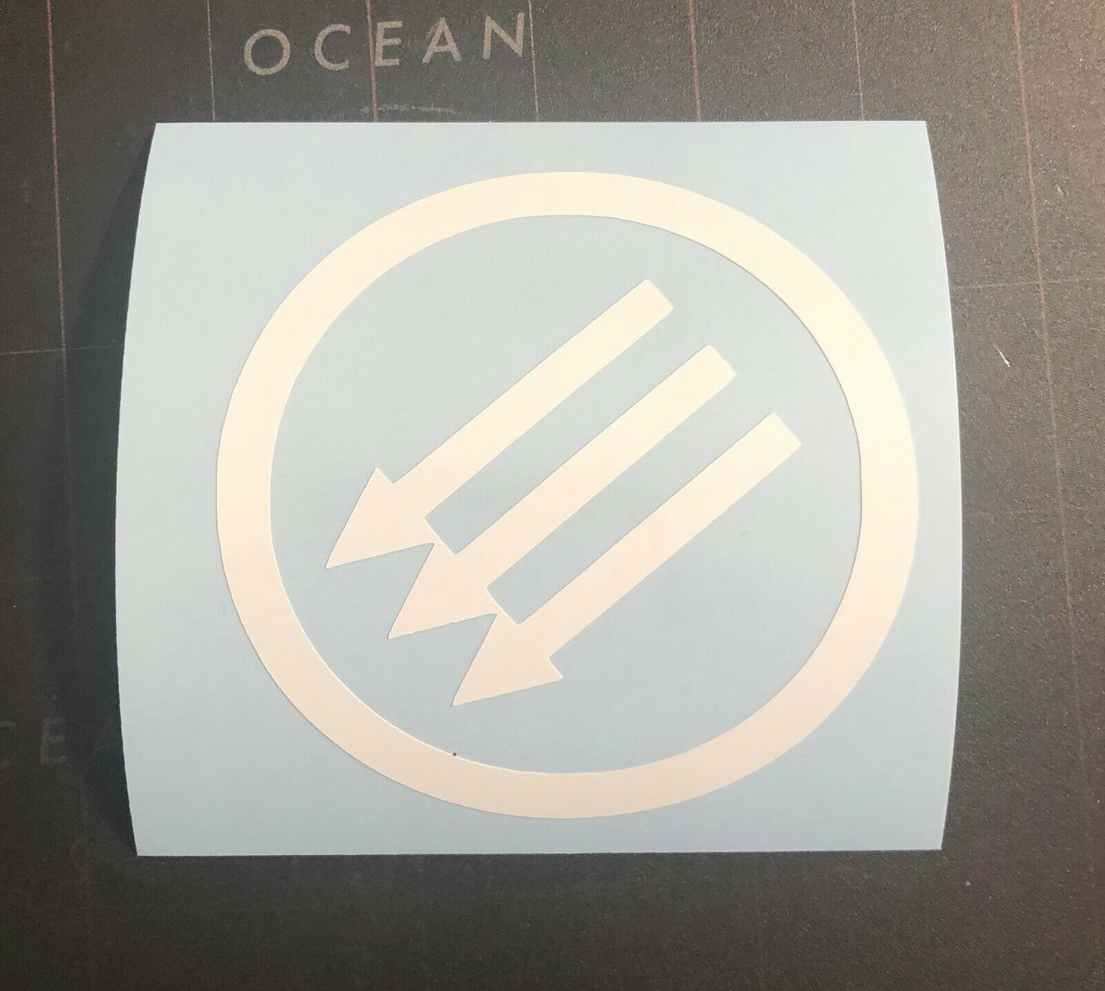 New white vinyl transfer rub on sticker. Peel off backing, stick on and leaves only the design. Measures approximately 3 X 3”.